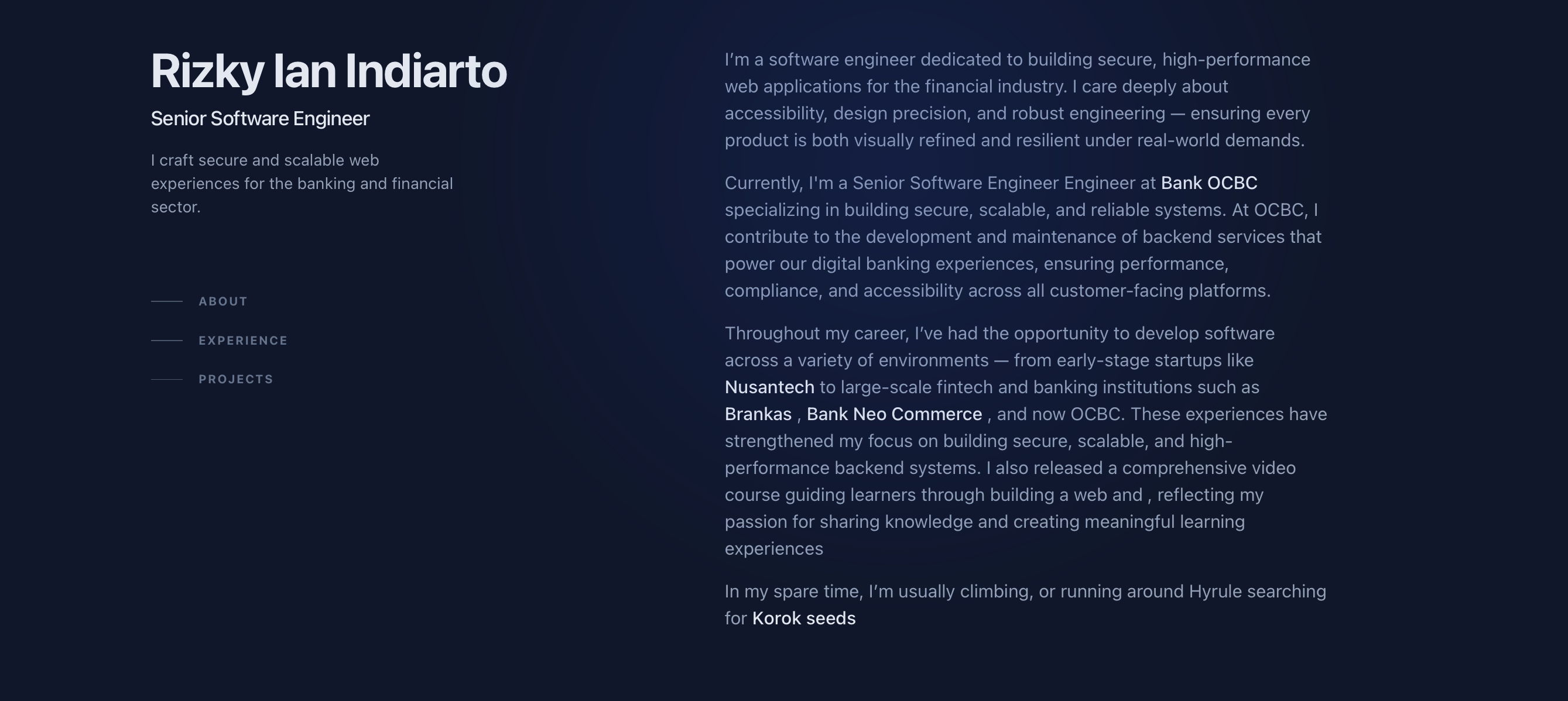 Currently, I'm a Senior Software Engineer Engineer at Bank OCBC specializing in building secure, scalable, and reliable systems. At OCBC, I contribute to the development and maintenance of backend services that power our digital banking experiences, ensuring performance, compliance, and accessibility across all customer-facing platforms.